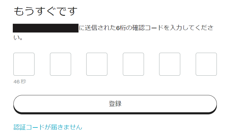 メールアドレスまたは携帯電話番号宛てに確認コードが送信されますので、入力して「登録」をクリックします。