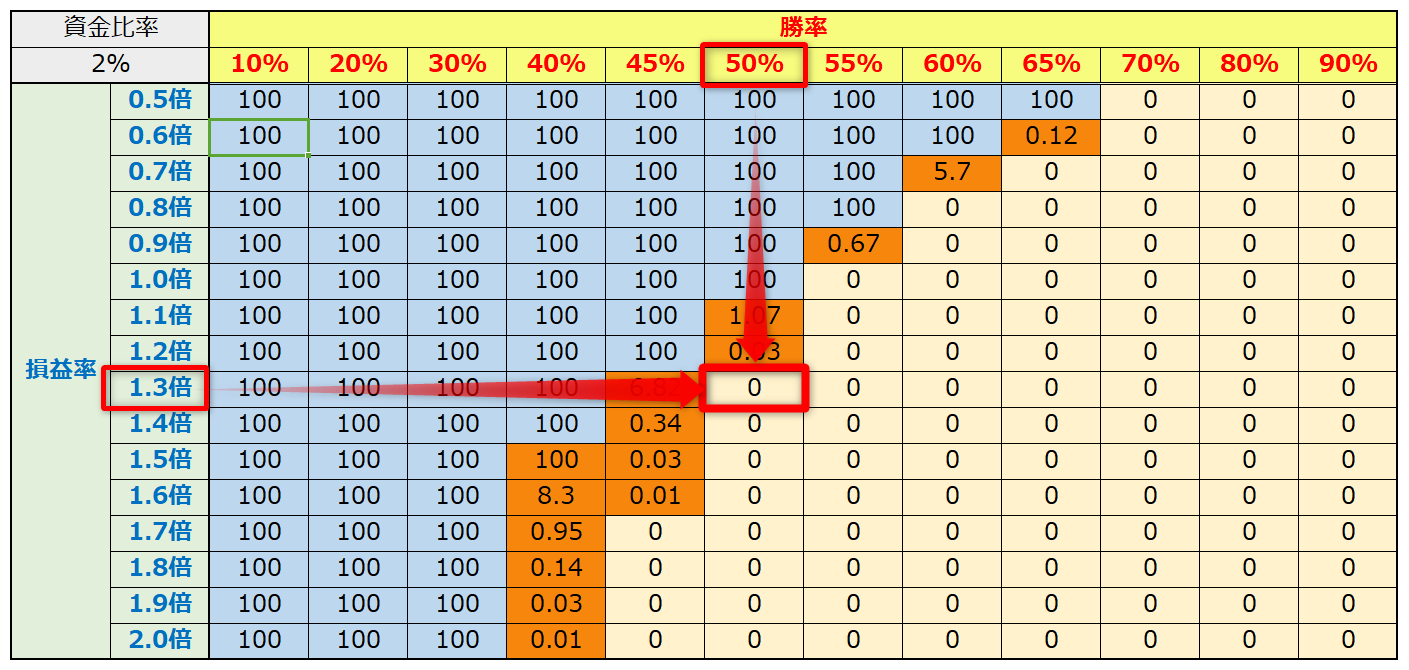 バルサラの破産確率表にあてはめてみると破産確率は「100%」ということになりました。