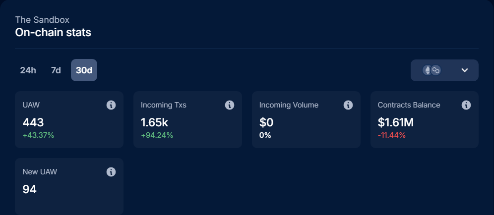The Sandboxは、ディセントラランドよりやや少ない水準の1カ月で約450のアクティブユーザー数でした。