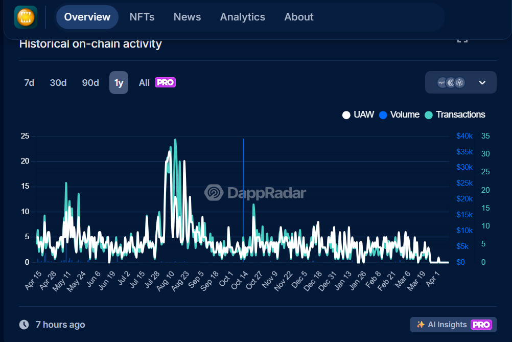 過疎り具合は、X(Twitter)などの口コミからも読み取れますが、ブロックチェーンゲームではトランザクションを外部から確認できるため、アクティブユーザーの目安も把握することができます。