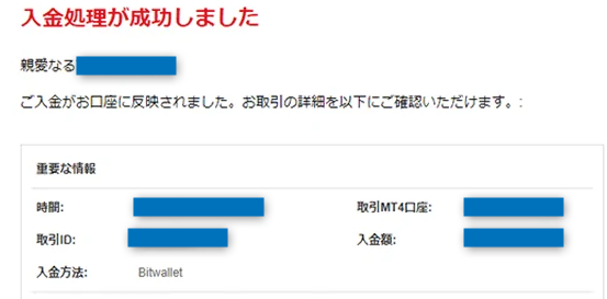 bitwalletによる入金が確認されると、XMから「入金処理が成功しました」というメールが届きます。